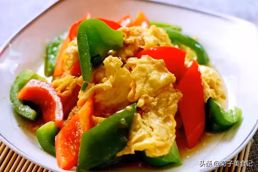 第三步:油鍋燒熱,放入雞蛋翻炒,然後把煎好的雞蛋起鍋待用,把菜椒放入油鍋炒至變色,再放入煎好的雞蛋,加入生抽少許,鹽少許,撒上蔥花起鍋,一道簡單美味的婆婆炒蛋就搞定啦