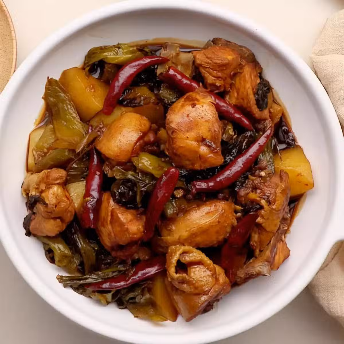 用料 雞肉 600g 土豆 1個 酸菜 150g 大蒜 30g 花椒 3g 干辣椒 10g 食用油 10g 生抽 10g 老抽 15g 鹽 1g 冰糖 15g 清水 500g