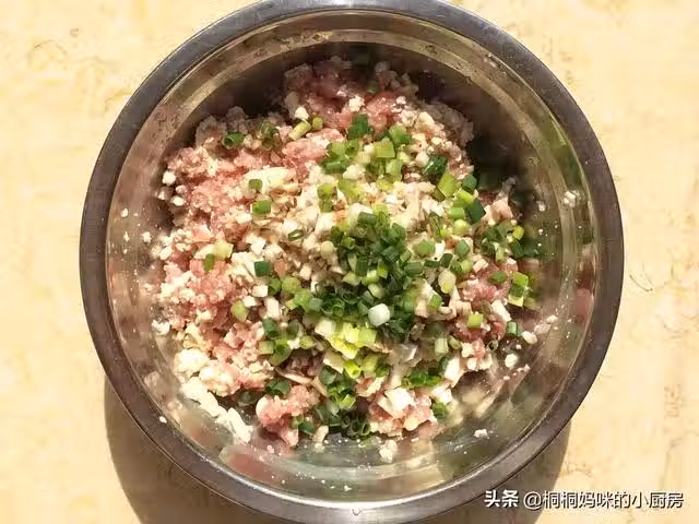 接著放入香菇、蔥花和蒜蓉(也可用薑蓉)與肉餡拌均勻,然後適量蚝油、特鮮醬油、料酒、鹽和玉米油調味。注意:肉餡可以稍微調淡一點,因為最後還會做一個醬汁澆在豆腐盒子上。