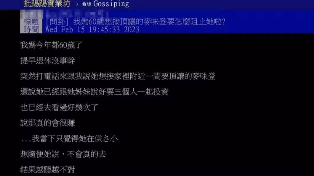 但也有網友認為,小本生意可以試試看:「用65萬買來媽媽的快樂,無價。」、「難說,媽媽有閒錢去玩玩也不錯~」、「缺人的話...我已經看到你幫忙顧的畫面了。」、「恭喜!假日要去當免費勞工了。」