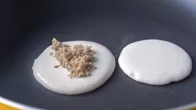 2、平底鍋預熱 不用刷油,用勺子舀一勺麵糊倒入鍋中,鍋一定要提前燒熱,否則你的麵糊是不能馬上定型的,就攤不出好看的小餅了。