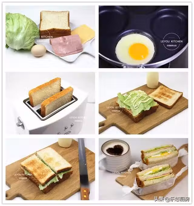第五步:將疊好的三明治放輕輕壓一下,然後用刀切成自己想要的形狀即可。(形狀隨自己喜歡,可以切成方的或者三角形,也可以將邊去掉,這些都隨自己的喜好來。)