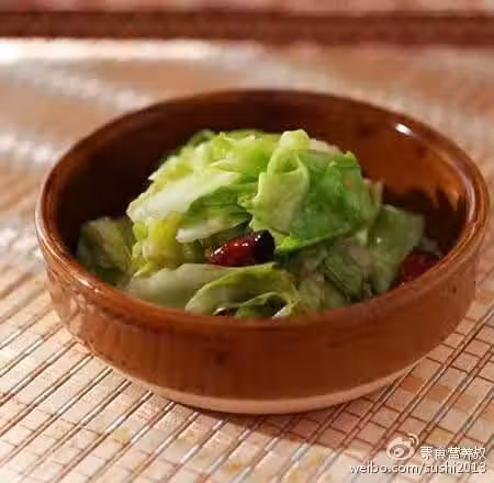 原料:圓白菜半個、生薑3片、干紅辣椒5個、糖1湯匙、醋1湯匙、鹽1茶匙、蘑菇精1茶匙