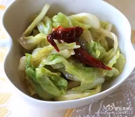 原料:圓白菜1個(300g)、花椒5g、辣椒干5個、醋1茶匙(5毫升)、生抽1茶匙(5毫升)、白糖1茶匙(5g)