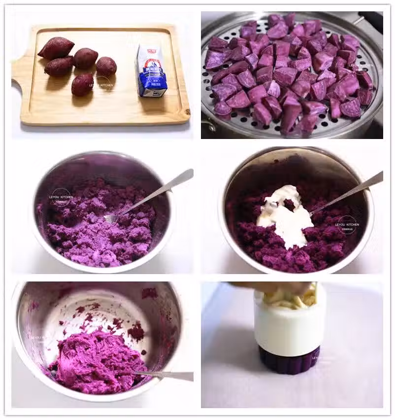 4、紫薯在放到模具里壓成花樣的時候,難免會粘模具。為了防粘,大家可以往紫薯表面抹上薄薄的一層熟油,然後再放到模具里。熟油就是把食用油加熱到四五成熱,然後再晾涼。