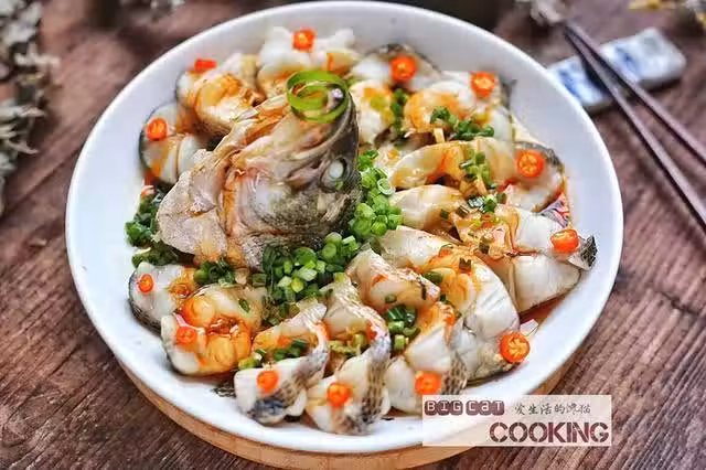 5,出鍋後倒掉裡面的汁水,蔥花切碎碼在魚身上,再將食用油燒熱,澆在魚肉上即可。