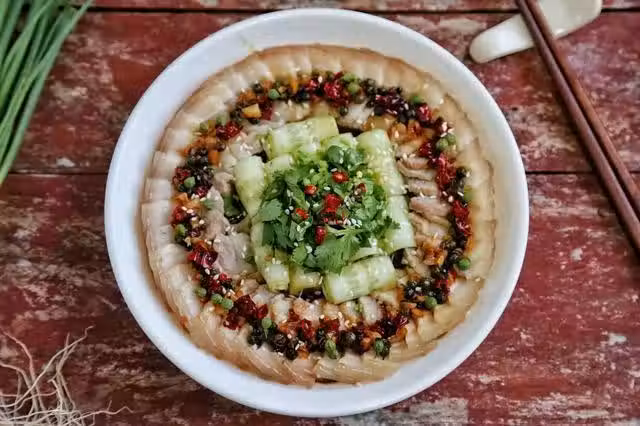 五花肉400克,黃瓜1根,新鮮藤椒30克,料酒10克,花椒2克,醬油15克,蚝油15克鹽2克,醋10克,糖5克,干辣椒3根,蒜末5克,香菜適量,菜籽油適量,雞粉2克