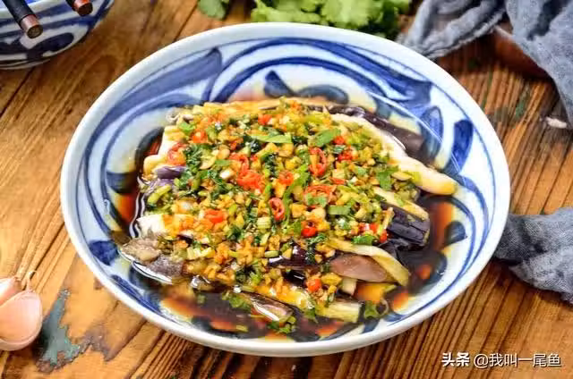 材料:茄子2根、大蒜6瓣、小米椒2個、香菜1根、香蔥1根、鹽3克、生抽2湯匙、香醋1湯匙、糖15克