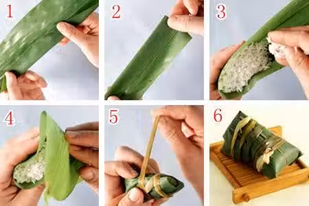 3、將粽葉打開,填入糯米,盡量將糯米填成一個長條形狀。