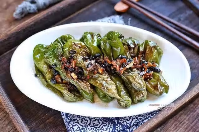 2,熱鍋,往鍋里倒入油,把瀝干水的尖椒放入,轉中小火慢慢煎麵。