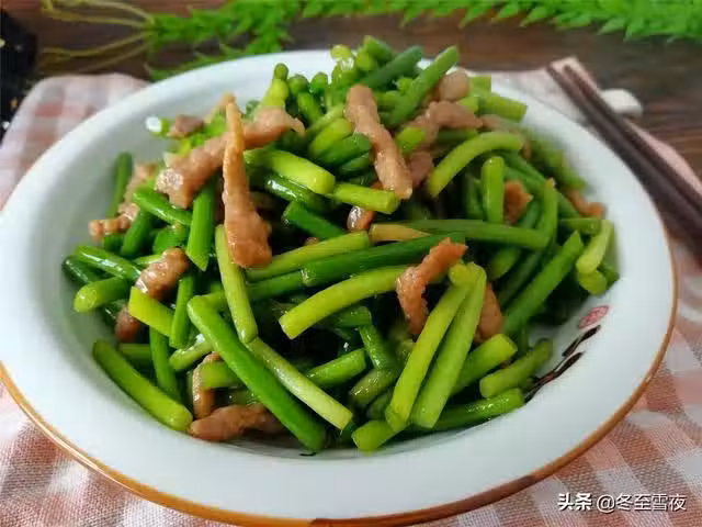 材料:蒜薹300克、豬肉150克、油鹽適量、姜2片、生抽1湯匙、料酒1\2湯匙、澱粉1\3湯匙、