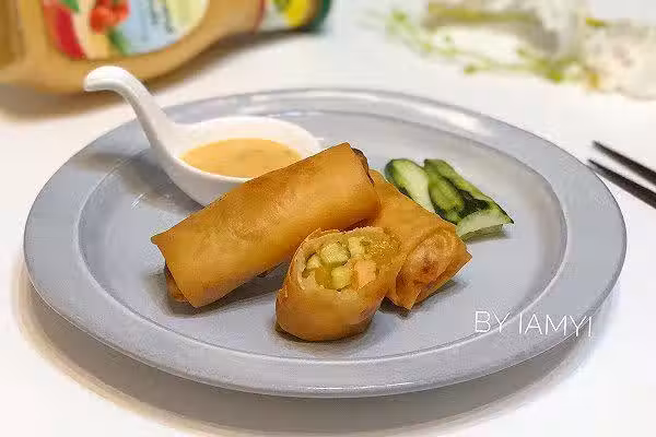 5 熱油鍋放入春捲炸至表面金黃色即可
