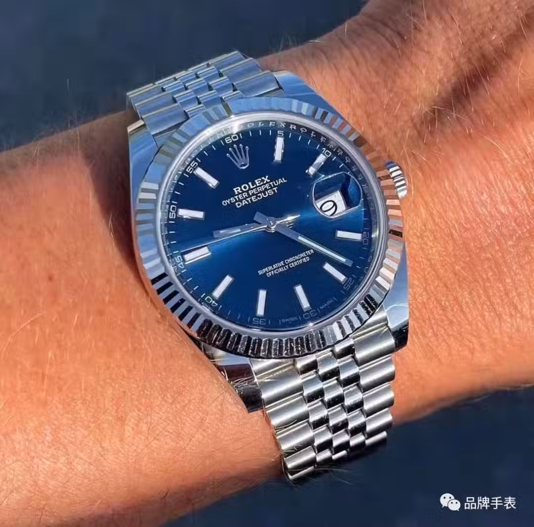這隻藍色日誌造型經典典雅,搭配西裝在袖口間微微露出,盡顯紳士風度。勞力士為這款腕錶配備了41毫米的表殼,三角坑紋表圈由18ct白金材質。以拋光打磨處理。深邃大氣的藍色盤面搭配立體條形刻度與外圈的阿拉伯數字,3點位置處品牌為其配備了醒目的日曆顯示窗口,並設有標誌性小窗透鏡裝置,無論是顏值還是品牌效應都相當不錯。