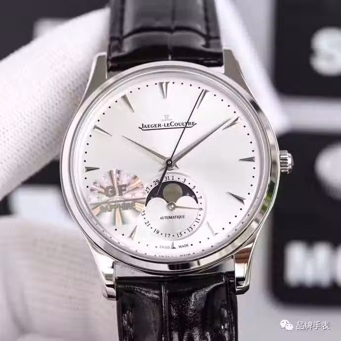 積家的大師系列月相腕錶,採用39毫米不鏽鋼表殼,打磨光滑圓潤。銀色的錶盤,大三針的顯示搭配藍色秒針,讀時清晰明了。月相顯示窗口位於6點鐘位,除了月相顯示外還有日期顯示功能。月相串口精緻美觀。搭載積家925自動上鏈機芯,提供約為43小時的動力儲備。