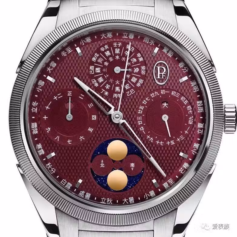 驅動著Tonda PF夏曆腕錶的「內在引擎」是品牌獨家自製的全新PF008機芯,18K白金鍍銠時標和鏤空時針與分針居於錶盤中央位置,顯示天干地支、生肖與五行的年份副錶盤被設在12時間位置,9時位置的副錶盤顯示閏年與月份,6時位置則是月相顯示窗,3時位置用於顯示日期與大小月信息(29或30天)。由於中華曆法並非完全循環有序,該複雜功能是通過機械編設,並通過凸輪系統涵蓋了十二年的周期。在該周期結束時,腕錶必須重置新一輪的十二年周期。