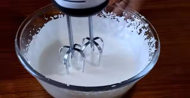 4、 在碗里加入白糖、牛奶,隔熱水用打蛋器將其打發,就像打發後的蛋白一樣,發白、變蓬鬆細膩;