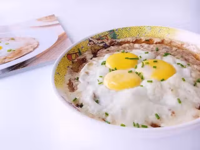將蛋清均勻的淋在肉糜上,把蛋黃放在最上面。
