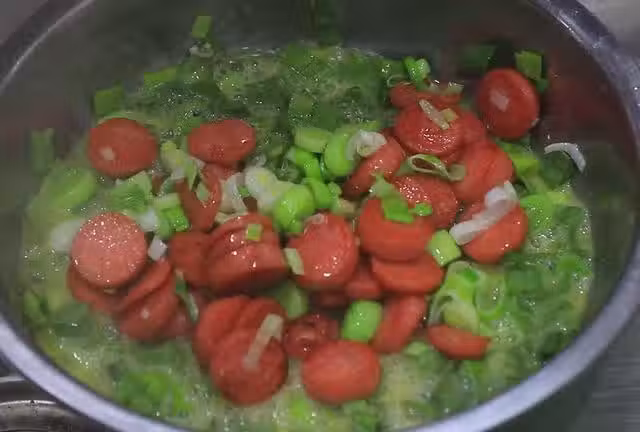 4、鍋內再燒油,油溫六成熱時,把蒜苗蛋液倒入鍋中,開小火煎炒,一面定型以後翻過來煎另一面。經常搖晃鍋,讓蛋液均勻受熱,蛋液全部凝固呈金黃色時,用勺子快速炒散,清香滑嫩的蒜苗雞蛋就能裝盤上桌了。
