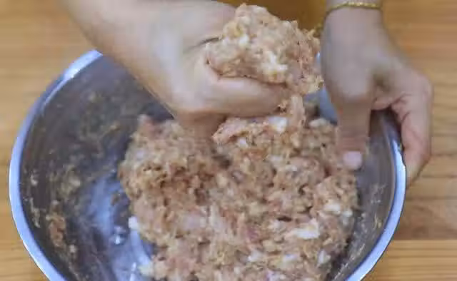 3、剁好的肉餡放入盆中,加入食鹽、雞粉、適量的老抽上底色,再加入生抽提一下鮮味,倒入剛才打好的蔥姜水,下手把調料抓勻,順著一個方向攪拌、摔打,使肉餡吸收調料,再次加入蔥姜水,繼續攪拌摔打。