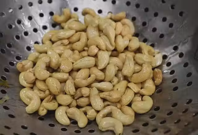 2、鍋內多燒一些油,油溫兩成熱倒入腰果,小火炸出裡面水分,火太大的話容易糊,慢慢的升高油溫,把水分炸干,腰果微微發黃以後關火,繼續炸上五六秒鐘倒出來,餘溫下腰果會變成金黃色,晾涼以後會非常香酥。