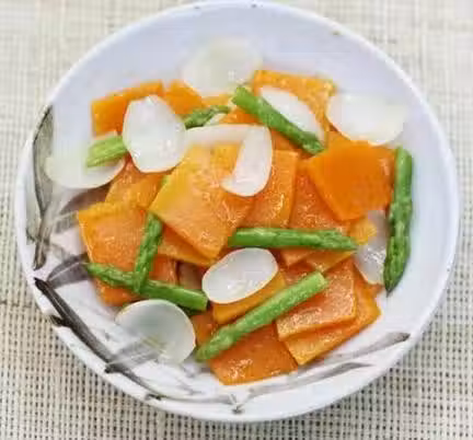 鍋中燒開水,先下蘆筍焯至水再次開起,然後下入南瓜也燙至鍋中水開,馬上一起撈出,過冷水後控掉水分待用