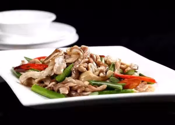 4、再上鍋,倒入花生油,火要大,將油燒成十成熱(會冒黑煙時),放入豬肚爆炒。