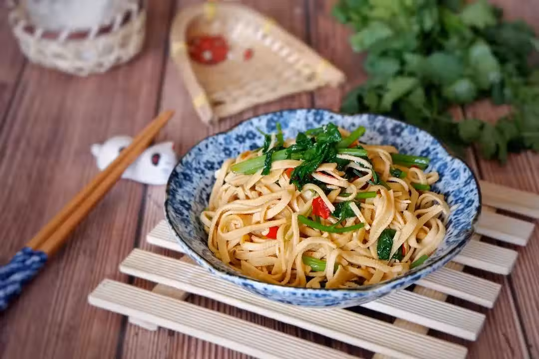 6. 在下入豆皮翻炒片刻,下入香菜莖、生抽、鹽、少許水翻炒均勻;