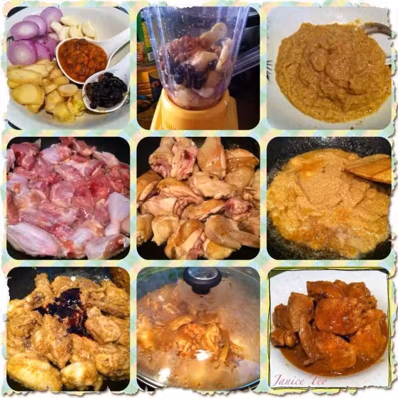 雞1隻洗淨切塊,嫩薑切塊半碗,蔥5粒切塊,蒜8粒,豆瓣醬2湯匙,豆豉1湯匙。