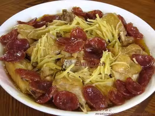 2) 放入薑絲和臘腸,預熱蒸爐,以大火蒸20分鐘便可。