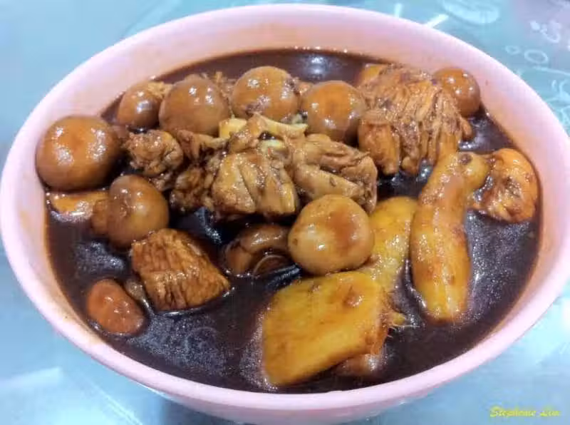 2) 將磨菰和雞腿炒片刻,加黑醬油,醬油和麻油炒香。