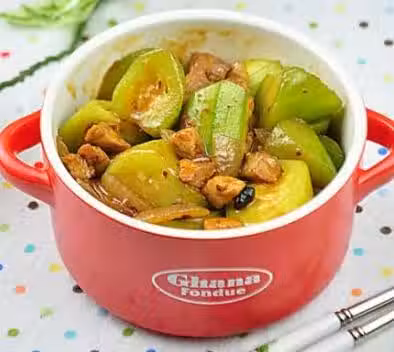 6、燉大約3-5分鐘,絲瓜變軟,即可關火,放入少許雞精攪拌均勻,即可出鍋裝盤