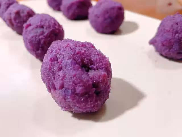 3、 紫薯蒸好了之後,用勺子搗成紫薯泥,加入一點白砂糖這樣更加甜,然後將紫薯搓成一個個大小相等圓形;