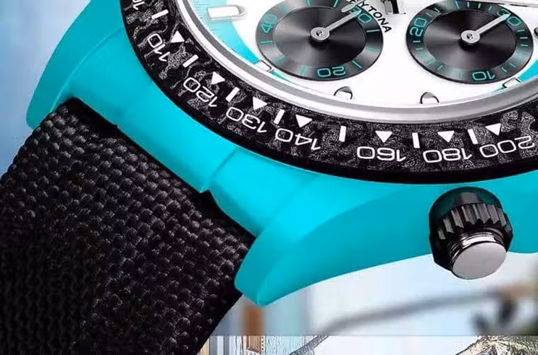 面盤的色彩組合又再更豐富些,包括外圍刻度環是蔚藍色、面盤內圈是白色,三眼小錶盤又換成黑色搭配同心圓紋裝飾,細看小錶盤外圍的刻度也以蔚藍色妝點,而指針與時標的夜光物料還是沿用原廠的白色,加入白色調的面盤彷彿聖巴瑟米集體天空上的白雲,如此一來手錶一口氣將海洋與天空連成一氣,每當看著手錶欣賞它的獨特造型時,閉上眼似乎也可以感受到海風輕拂的愉悅感受,這正是DiW想要詮釋的意境,在勞力士紮實強悍的手錶基礎下,藉由材質與配色的改造,賦予手錶更生動活潑的個性,佩戴在手上的舒適度與滿足感同步獲得進化。