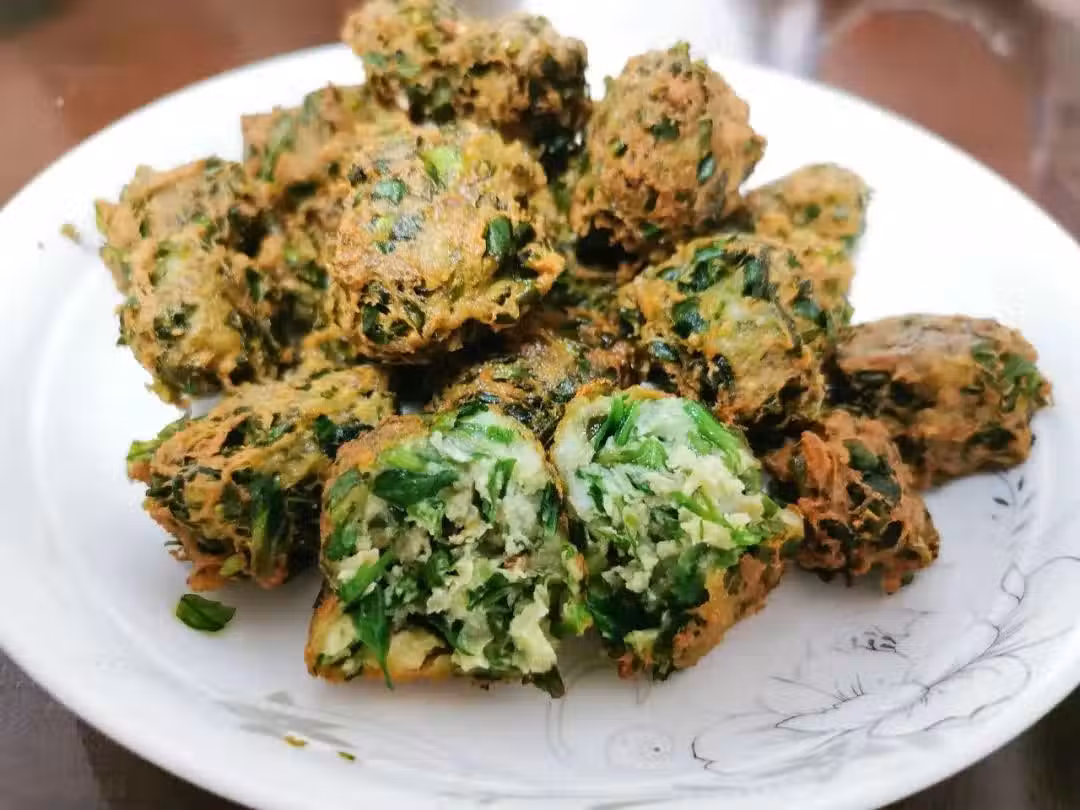 做法: 1. 茼蒿洗凈,切碎,取適量鹽和五香粉灑在茼蒿碎里,拌均勻(撒入鹽後,茼蒿會出水)。 2. 取適量麵粉(別放太多),跟茼蒿拌勻(勿放水),以能輕鬆捏成圓球即可。此時丸子還是比較濕潤的狀態。 3. 搭油鍋,七成熱時下丸子,炸至淡金黃色撈出(撈出後丸子的顏色還會加深)。 4. 瀝油,完工,擺盤(可沾些喜愛的調料、醬料等食用)。