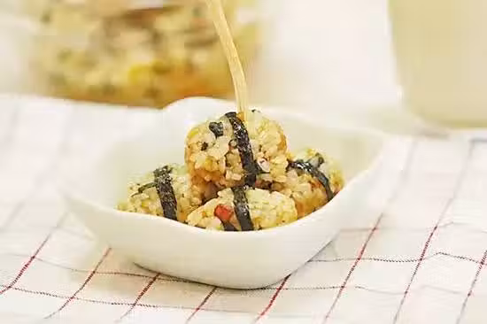 4、取適量飯糰用手揉捏成小圓球,在上面擠上適量沙拉醬即可