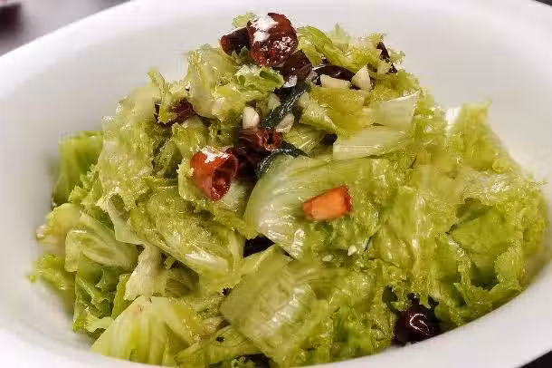 食材:生菜適量、色拉油適量、食鹽適量、醬油適量、雞精2克、蒜5克、干辣椒適量、生抽適量、白糖2克、白醋適量、蒸魚豉油適量、芝麻油少許。