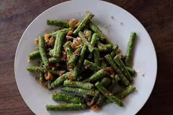 1.、將四季豆洗淨,去除粗纖維、切段。