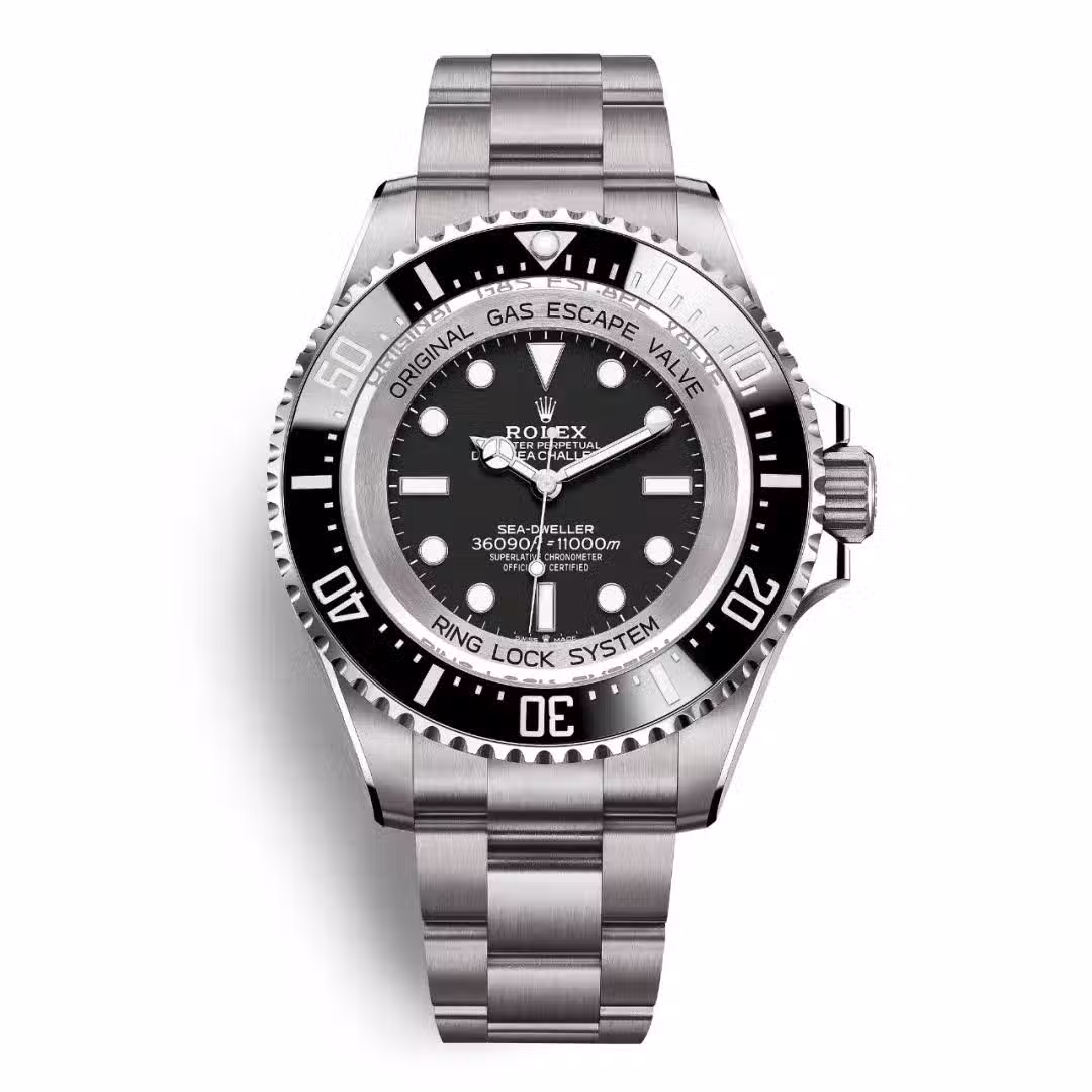 錶盤布局延續 Rolex 潛水錶的經典元素,你可以看到標誌性的 Mercedes 指針和棒棒糖秒針,Chromalight 螢光塗料確保在深海中亦能清晰讀時。值得一提的是,黑色錶盤採用啞光處理,而非 Rolex 常用的拋光飾面。表圈鑲嵌 Cerachrom 刻度圈,數字和刻度均鍍有鉑金。錶冠新增圓點標誌,代表由 RLX 鈦金屬製作。
