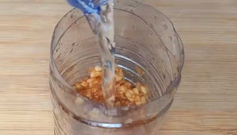 接下來往裡面加入適量的清水,我們在加水的時候不要加太滿,大概加到八分滿就可以了,然後用搟麵杖把它們攪拌一下,使蘋果和水充分的融合在一起,