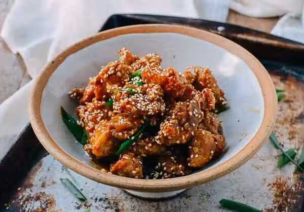 7. 將醬汁倒入熱鍋,大火收汁,最後撒上蔥花,芝麻香雞就出爐啦。