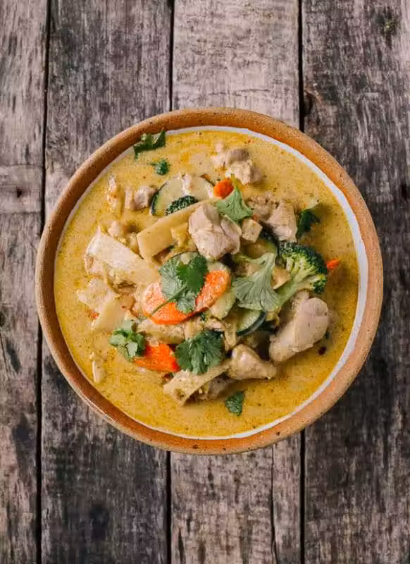 雞肉、咖喱、洋蔥、西蘭花、紅蘿蔔、葫蘆瓜、羅勒葉、椰奶、油、糖、辣椒油
