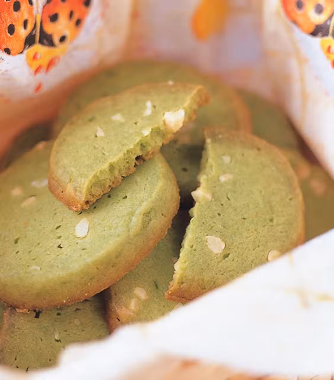 7 將冰硬的抹茶杏仁麵糊取出搓成圓柱狀再切成約0.5公分厚度的圓片狀鋪在烤盤上