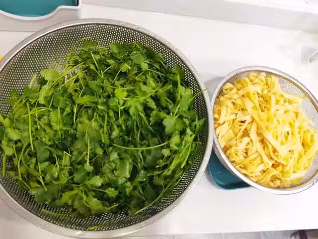 3、 準備一個大碗,把香菜和千張一起倒進去混合均勻,加適量鹽、糖和生抽,用筷子攪拌均勻。