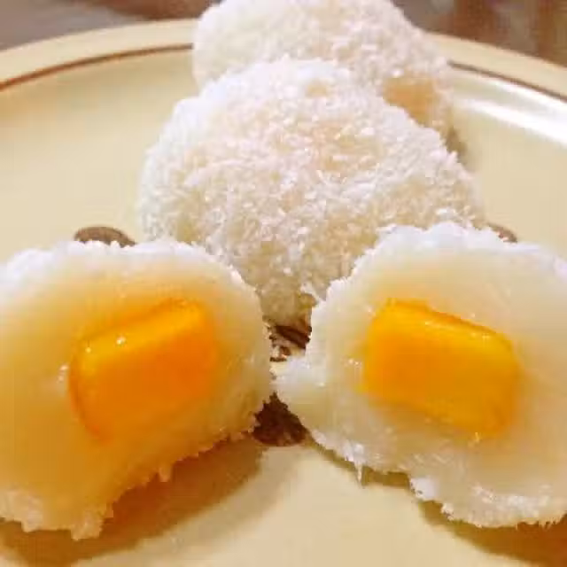 4、準備好蒸熟放涼的粉團、芒果肉、椰蓉,開始包陷。