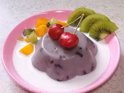 4、熱好的椰奶加魚膠粉迅速拌開,加入紫米繼續拌勻。