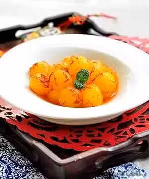第二步:鍋中放入兩杯水,加入榨出的橙汁。再加入白糖煮開。將冬瓜球放入湯汁。略煮一會,加入藏紅花汁調色。,湯汁收的差不多時,放入泡好的藏紅花。炒勻收汁出鍋即可。