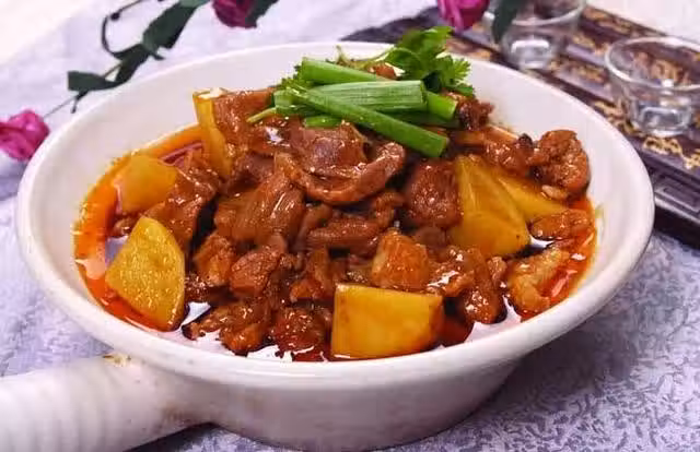 7、中間可適當作一兩次翻攪,兩個半小時後,加入土豆塊並攪拌均勻,再燜煲 30分鐘出鍋。