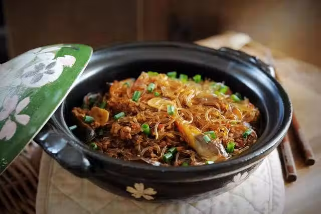 下粉絲肉末,豆瓣醬或老乾媽,糖和清水,炒1分鐘後全都倒入土鍋里。