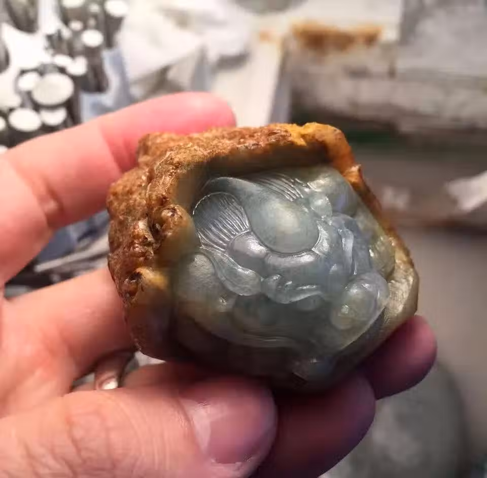 教科書般翡翠原石皮殼雕刻運用,地麒麟活靈活現