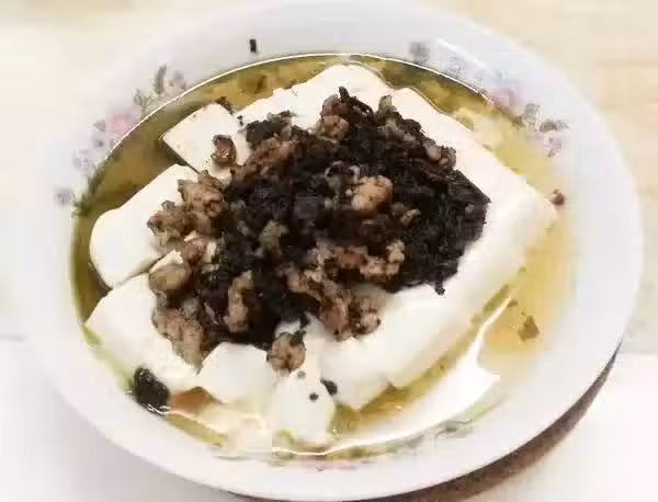 3. 放入蒸鍋,加蓋大火蒸10分鐘,生抽、清水、砂糖放入鍋內煮至水開,做成碗汁,淋在蒸好的豆腐上即可。